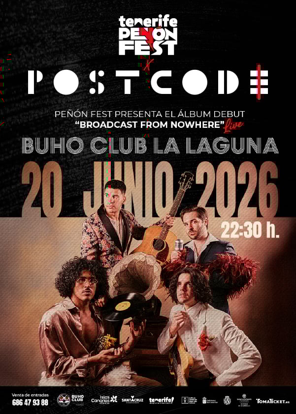 El grupo POSTCODE presenta su último trabajo "Broadcast From Nowhere" el próximo 20 de junio en San Cristobal de La Laguna, concretamente en Búho Club, como parte del programa de actividades paralelas enmarcadas dentro del festival Tenerife Peñón Fest, cuya próxima edición se celebrará los días 23 y 24 de octubre en el Parking del Palmetum de Santa Cruz de Tenerife. Tras su lanzamiento en febrero de este año, POSTCODE presenta su álbum en casa, en Tenerife, en una cita muy especial para la banda.