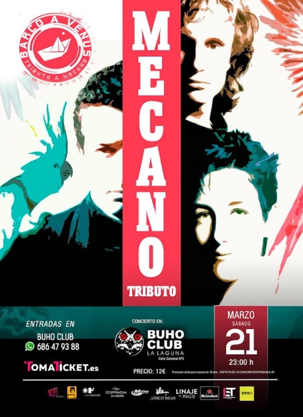 ¡Revive los grandes éxitos de Mecano con el tributo "Barco a Venus" en el Búho Club de La Laguna! Disfruta de una noche inolvidable llena de nostalgia el próximo sábado 21 de marzo a las 23:00 horas. Este homenaje recrea las canciones más icónicas de una de las bandas más legendarias de habla hispana. Compra tus entradas ya por solo 12€ en Tomaticket.es o en el mismo Búho Club (Calle Catedral Nº3). Para más información, contacta al 686 47 93 88. ¡No te lo pierdas!